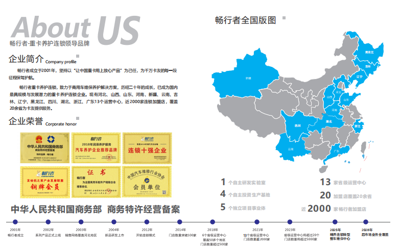 畅行者重卡养护连锁,自2012年内成立,已稳健的发展10年时间,2016年通过中